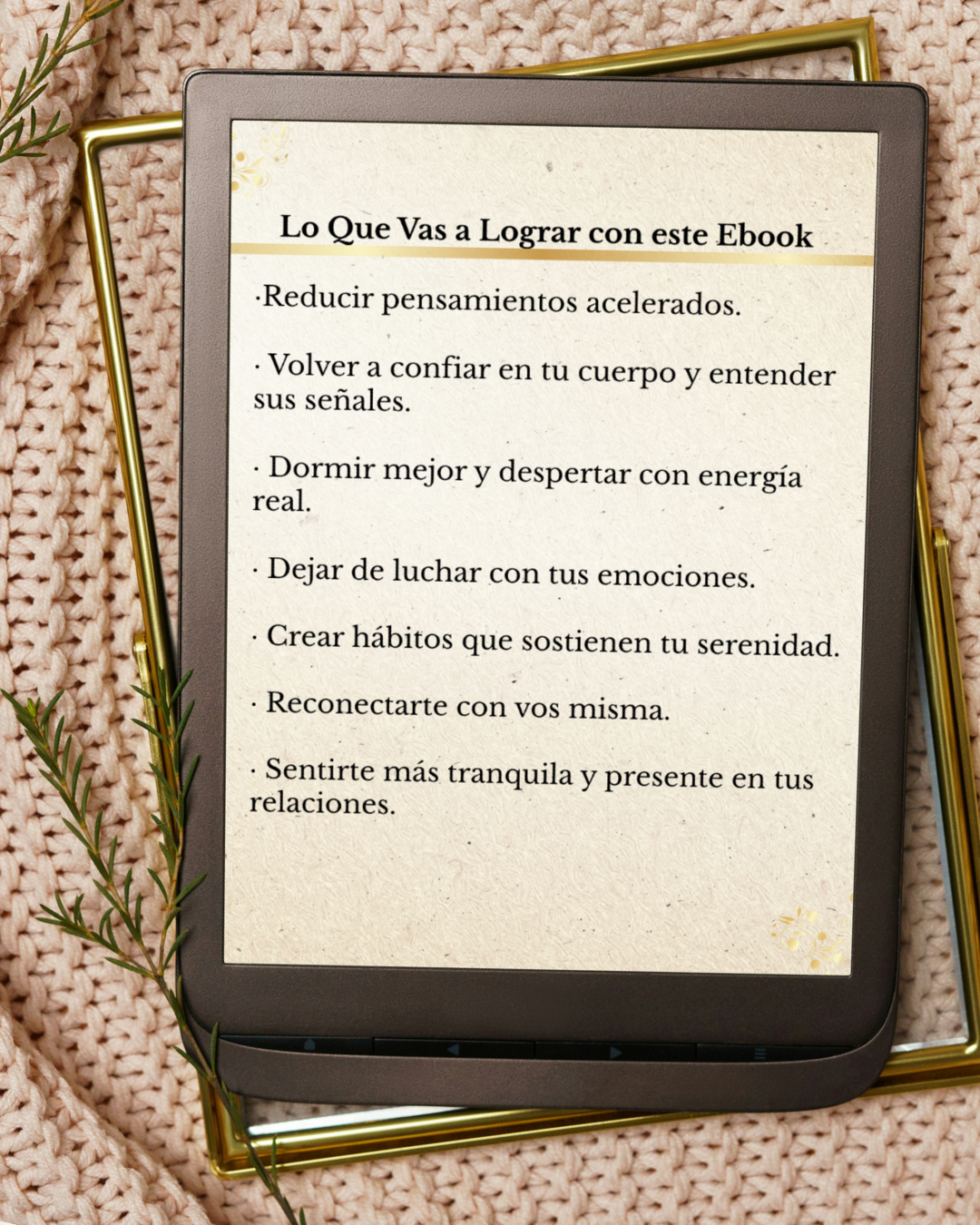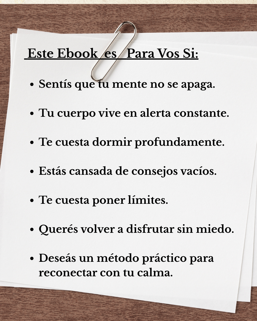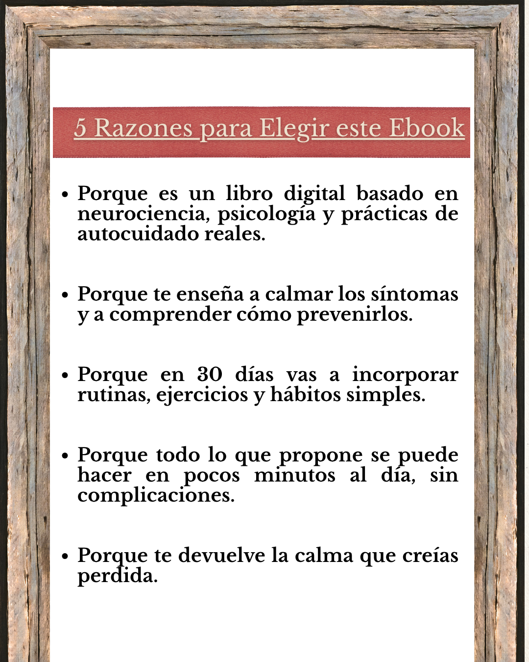 El ebook incluye un programa completo de 30 días con explicaciones científicas, ejercicios diarios, prácticas de respiración, estrategias para regular el sistema nervioso, hábitos de calma, rutinas de descanso y herramientas emocionales para acompañarte.